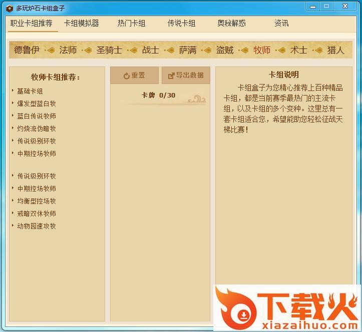 最新、最全的职业卡组推荐。当然你也可以根据实际情况,使用模拟器对推荐卡组进行修改。