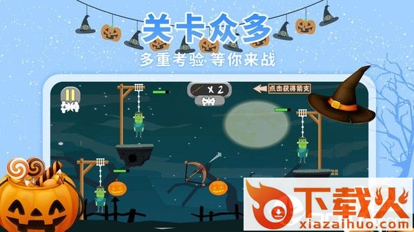 2、超多的关卡设计,游戏十分考验玩家的操作能力,让弓箭准确的射断绳索。