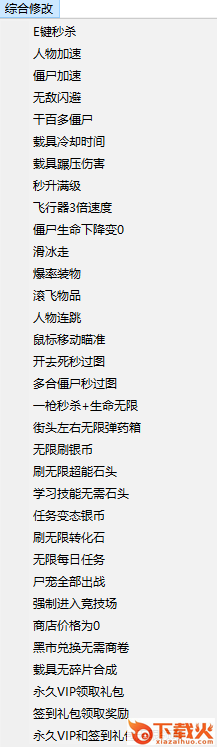 E键秒杀、人物加速、僵尸加速、无敌闪避、干百多僵尸、载具冷却时间、载具碾压伤害、秒升满级、飞行器3倍速度、僵尸生命下降变0,滑冰走、爆率装物、滚飞物品、人物连跳、鼠标移动瞄准、开去死秒过图、多合僵尸秒过图、一枪秒杀+生命无限、街头左右无限弹药箱、无限刷银币、刷无限超能石头、学习技能无需石头、任务变态银币、刷无限转化石、无限每日任务、尸宠全部出战、强制进入竞技场、商店价格为0、黑市兑换无需商卷、载具无碎片合成、永久VIP领取礼包、签到礼包领取奖励、永久VIP和签到礼包无限领取;