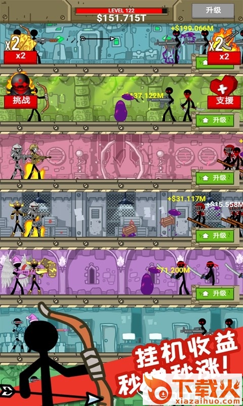 放置火柴人 是放置类策略射击游戏,玩家解锁不同层数能力各异的火柴人英雄,这些英雄拥有不同的战斗技巧来与敌人战斗。