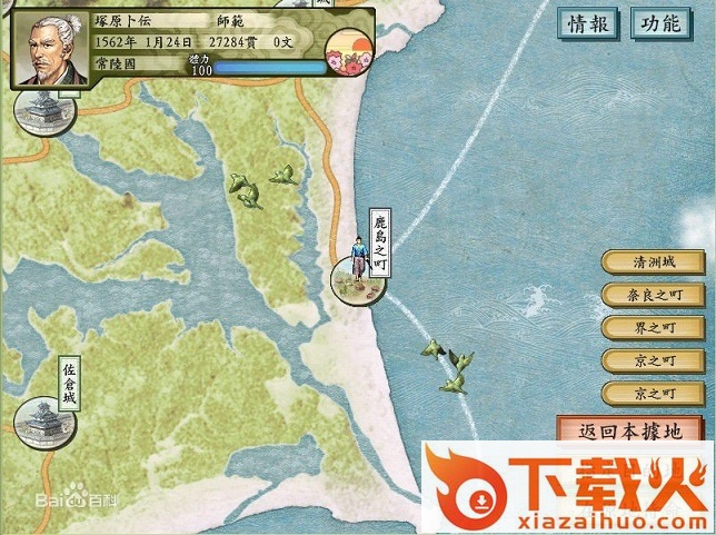 大地图上的各个圆圈,代表者城、町、里和砦,不同大小代表不同规模,圆圈越大规模越大。