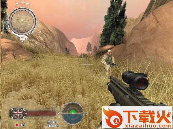 首先,你和队友降落在一片草原之上,先按F1看看地图,目的地就是前方的黄色圆圈。左前方有一个营地,我选择从地图左侧绕到此营地后面,F3切换到突击手(按G装上消音器)悄悄干掉帐篷内外两个敌人。继续从地图左侧的山坡前进,会看到一个塔楼,让狙击手干掉上面的哨兵。不要关瞄,继续干掉地面上若干个敌人。