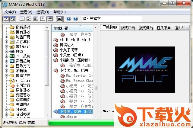 mameplus0.118是一个仿真程序。简单地说,它可以让一台PC大量单机街机机的内部硬件模拟从1975年到2003+。从这些街机原有的ROM的组合,mameplus0.118显示和玩的游戏在PC上,软件会认为您还是在原来的机器上运行。M.ultiple A.rcade M.achine E.mulator的GUI版本,它有一个有吸引力的,优雅的,图形化界面允许用户放弃不必键入命令行参数,但它仍然可以通过这些参数,例如,“mameplus0.118 dkong -r 1024x768x32 -refresh 85 -effect尖锐”。对于很多人来说它更容易点击游戏图标。