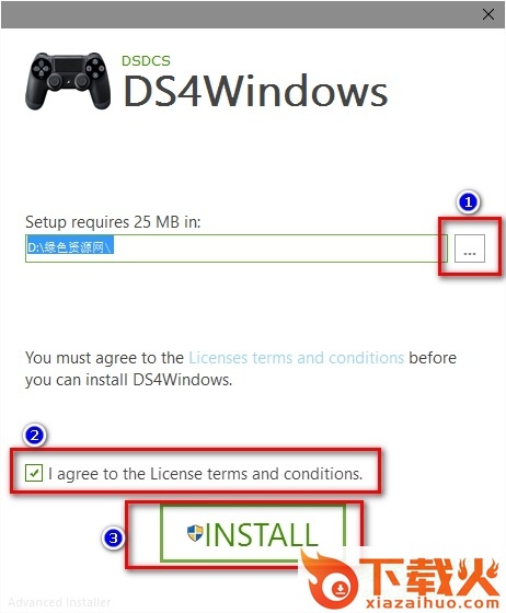 1.在本站下载ds4windows中文版,然后解压文件,双击"DS4Windows(1.5.9).exe"进入下图界面,然后按照小编为大家标记的顺序来设置安装目录和进行安装