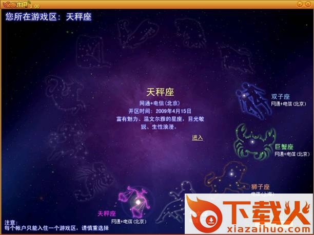 登陆游戏选择服务器界面,可以选择喜欢的星座,进行登陆游戏,每个账号只限登陆一个服务器,选择服务器后将无法更换其它服务器。请慎重选择。