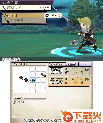 本作作为一款日系rpg,其核心玩法也是相当经典的回合制策略战斗。玩家控制的英雄以小队的形式在地图中活动,在和敌人相遇后进行双方轮流的回合制战斗。灵活运用武器技能、法术、阵型,是取得胜利的关键所在。人物装备武器不受类型限制,可以自由搭配,不同类型的武器具有不同类型的技能。每位人物最多可以佩戴两件武器,人物在战斗中需要先选择使用的武器,再在该武器能释放的技能中选择一个进行释放。有的技能在释放时要消耗sp点数,有的则不需要,不同的技能其造成的伤害输出或者治疗量的多少、技能是否附加其他buff或debuff、消耗的sp点数多少,都是玩家在战斗中需要考虑的要素。虽然大部分野外碰见的小怪都可以轻松解决,不需要在这方面做策略安排,但一旦遇到boss战或者精英怪,玩家就必须合理利用技能,巧妙安排小队里各个人物每回合的行动,根据战场形势审时度势,才能克敌制胜。法术与阵型在战斗中的运用也是同理。