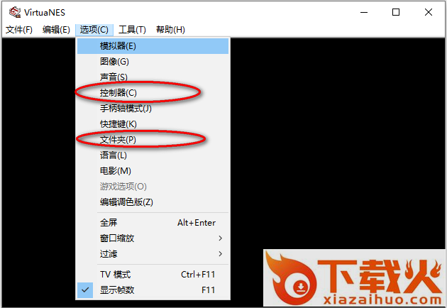 运行virtuanes.exe文件进入模拟器,弹出"选项"菜单,我们目前需要设置的有“控制器”,“文件夹”,“尺寸”。
