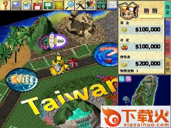 新建游戏后有12个人物可以选择,地图有4幅,分别为台湾、中国大陆、日本和美国,在资料片超时空之旅中又加入了四张新地图,分别是仙剑奇侠传、石器时代、星际宇宙、梦幻乐园。右边的选项决定游戏初期的难度和胜利条件。地图画面上方的按钮栏从左到右分别是帮助、选项、自动运行、调盘、存盘、全地图、查看人物资料、所有道具、所有卡片、出售栏、股市。