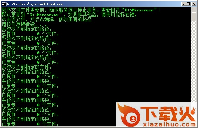 第二步:更新引擎,首先把我们需要更新的引擎包下载并解压好。在里面可以看到开始更新程序.bat文件,双击打开,回车就可以了,最后可以看到程序文件文件已更新完成。。就表示引擎更新成功了,也就是说服务端里面的引擎已经更换成我们想要的引擎了,如果提示系统找不到指定的文件或者系统找不到指定的路径,那么就需要没有成功。