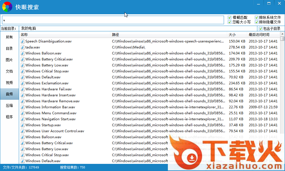 快眼文件搜索是一款可以支持通配符模糊查询、多种过滤方式、多种排序方式,为您带来急速的搜索体验的快速文件搜索软件。快眼文件搜索操作简单快捷且占用资源少。并且还可以快速搜索电脑中的图片、文档、视频、音频、压缩文件、程序等。如此方便的软件,赶快下载体验吧!!!