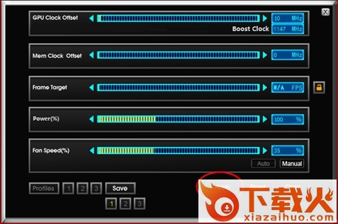 主界面非常简单,5个选项一目了然分别是:核心频率、流处理器频率、显存频率、风扇速度、核心电压,玩家可以通过右边的滚动条对其进行拖动调整。