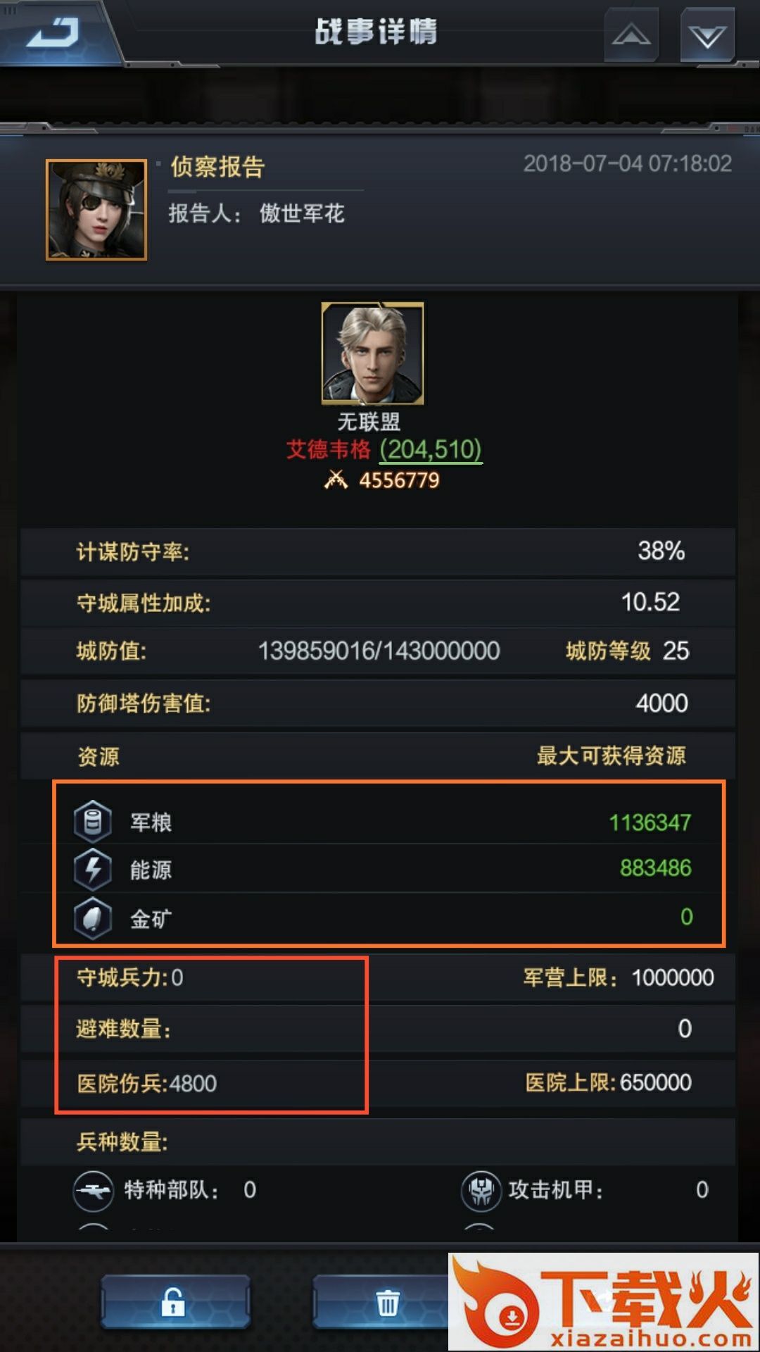 战报中,我们主要看资源和守城兵力的数量,再看目标是否有避难藏兵,掠夺资源不仅要做到不打没把握的战,还要做到大赚,尽量保证我们留有充足的兵力掠夺下一个目标;从上面侦查战报中可以看出,该玩家居然无人守城,没有避难士兵,只有医院理由伤兵,为了确保对方不是使用超级武器隐藏兵力而设的“空城计”,我方先使用了谍战技能对目标进行毒杀,结果发现没有毒杀到目标士兵,然后再侦查了一次发现没有减少军粮资源(对方在我方使用谍战时,如果使用避难所了会消耗军粮),从而判断目标确实没有使用超级武器,是真正的无人空城,由此,我方直接进攻目标。