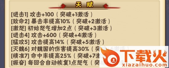 天赋上看,加攻击和暴击、伤害的比较多,对魏国的伤害提高30%很赞,和黄忠组合起来更是机智的选择。