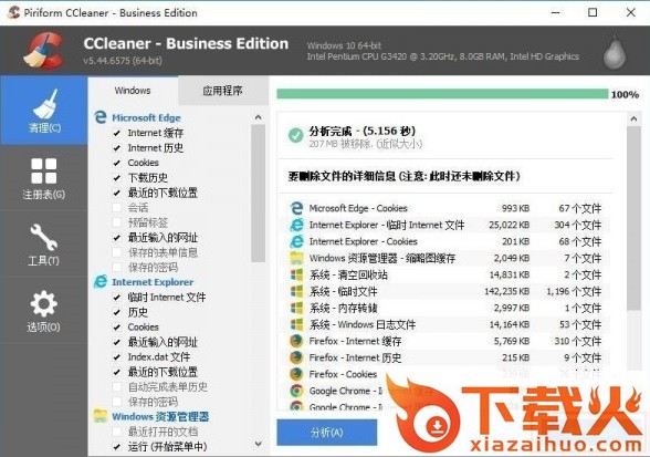 1.打开CCleaner,在最左侧点击选择“清理”功能。在此功能中,可以分别从Windows自带文件和其他应用程序下方的列表中勾选需要清理的项目,然后点击下方的“分析”按钮,将清理的条目列出来。