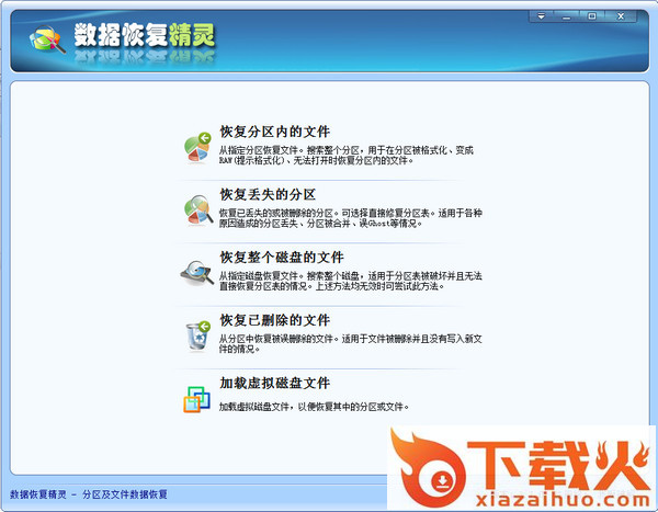 数据恢复精灵是一款功能强大、简单易用的数据恢复软件。数据恢复过程在5步内完成,用户群主要为普通电脑用户。常用功能有:恢复删除文件、恢复格式化文件以及恢复丢失的分区。支持的存储介质主要有电脑硬盘、移动硬盘、U盘、SD卡、TF卡、虚拟磁盘等。