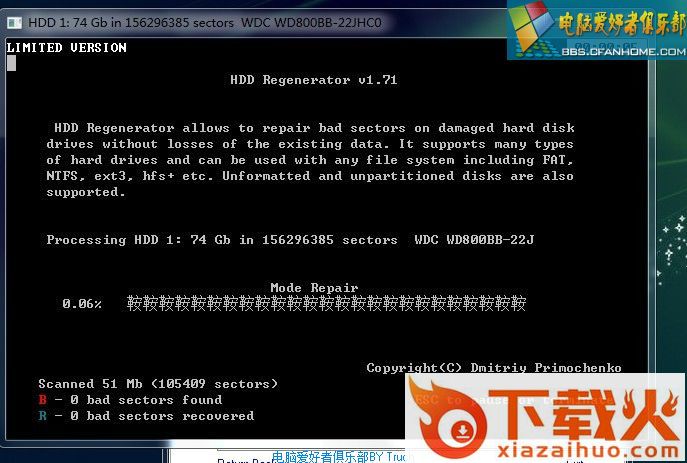 第六步,程序自动扫描你选择的硬盘,不用去管,当HDD扫描到坏道后会在进度条上显示红色的“B”字,随后就开始自动修复,修复好的用蓝色的“R”字标注。扫描并修复完后就可以正常的是使用硬盘了。
