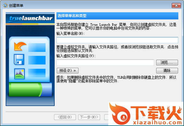 在True Launch Bar快速启动上点击“鼠标右键”-“新建”-“菜单”,即可弹出建立快速启动菜单的向导,为了讲述方便,我直接以在快速启动里建立一个我的电脑菜单,在创建菜单向导里,我直接点“预设”按钮选择“我的电脑”然后点向导里的“完成”即完成了菜单“我的电脑”的制作,其它的菜单建立都差不多,只不过其它菜单需要先在某文件夹内建立好快捷方式,然后浏览选择该文件夹即可