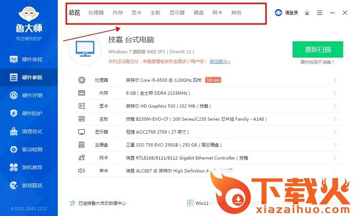 3、在上方还有每个参数性能的分类选择,在每一个分栏里可以看到各个硬件的详细参数