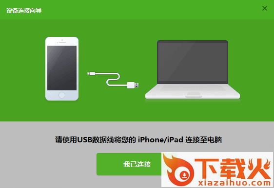 下载完毕后打开软件,点击立即连接,然后将ios设备用数据线与电脑连接在一起,点击我已连接即可将手机与小苹果助手连接到一起。