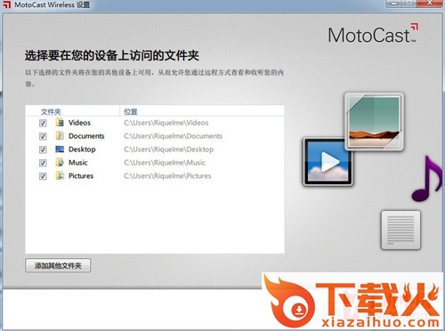 设置PC端允许MotoCast可以访问的文件夹,默认设置包括了,视频、文档、音乐、图片以及桌面,这里的翻译有个问题,右下角唯一的前进图表显示为禁用访问,应该是允许访问才对,我们还可以为MotoCast添加其他的文件夹,比如下载文件夹,这样访问下载的Android应用更为轻松。