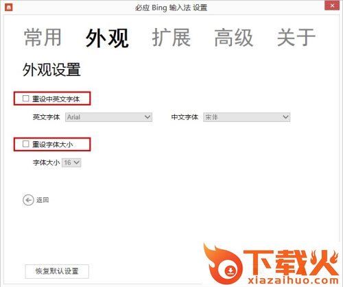 点击“设置”图标,选择设置属性-> 外观-> 外观设置,即可设置候选词的字体(中英文字体设置)和大小。