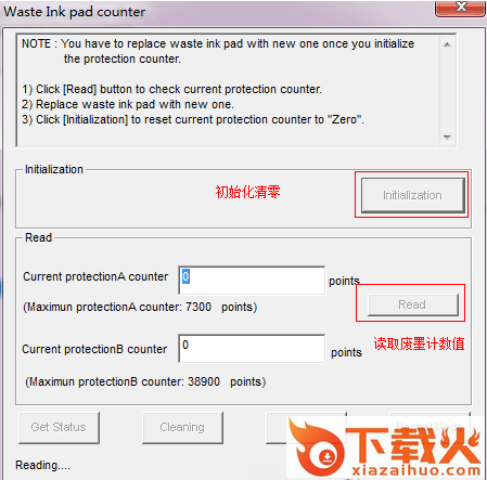 点击read按钮可以读出现在的废墨垫计数数据,点击initialiation进行清零操作。清零成功会弹出提示,点击确定重新开关打印机测试,如果没有成功请重新操作一遍