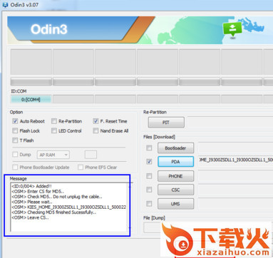 3、在Odin3点击pda选择你下载好的刷机包,这时候会卡一会,稍等出现蓝色框的文字,然后点击start开始刷机,刷机完毕后会自动重启;