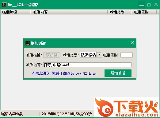 Rz_LOL一键喊话是一个方便玩家在LOL游戏中快速喊话的辅助工具。玩家可以使用本工具在游戏开始前先设置好喊话内容和快捷键,然后在游戏中便可以一键快速喊话指挥队友操作了。使用Rz_LOL一键喊话方便玩家指挥和节省打字的时间,有需要的玩家欢迎下载使用。