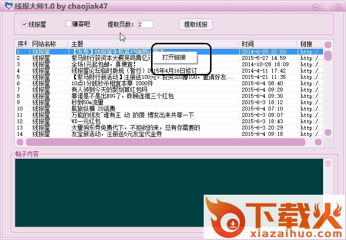 线报大师是一款由热心网友chaojiak47专门针对线报屋论坛制作的帖子提取工具,线报大师能帮你快速批量提取线报屋、赚客吧上的最新交易帖子,为你快速领取各种礼包、红包、话费以及各种活动优惠券等等,精打细算,先人一步,是你的个人理财以及网赚的好帮手!欢迎免费下载这款线报大师!