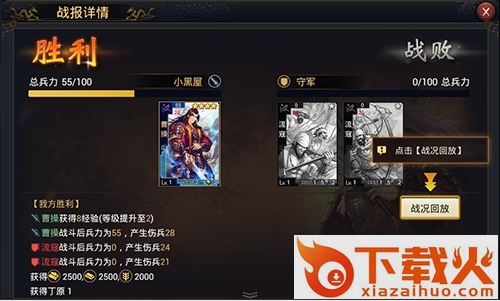 4、战斗结果显示,胜利并占据领地。部队到达目的地就会马上开始战斗,如果双方实力相差悬殊,战斗会马上结束,己方胜利就可将目的地占据,失败就会损失较多兵力,而无论胜负,武将都可获得经验。如果对战双方势均力敌,那么战斗结果会暂时显示“平局”,并在5分钟后进入下一轮对战,直到决出战斗胜负。玩家也可以在此5分钟之内增派援军到达目的地,帮助己方部队获得胜利。