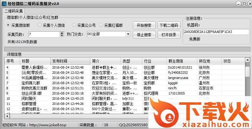 轻轻微信二维码采集精灵是一款科技帮助你采集微信群、个人群、公众号、红包群等对象的二维码信息让鸡,包括行业类型、群主微信、所在地区、对方简介等,是你做微商加粉、产品推广的好助手,绿色资源网欢迎下载!...