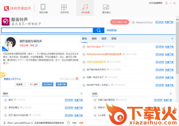 “快用苹果助手”是北京悠然天地有限公司旗下品牌产品,是国内首款支持苹果IOS应用一键下载、安装的PC端辅助工具。因其简单、安全、下载快速、免越狱的特性,在广大果粉群体中掀起使用热潮。 让苹果手机用户在无需越狱的情况下就可以免费安装正版的应用软件。