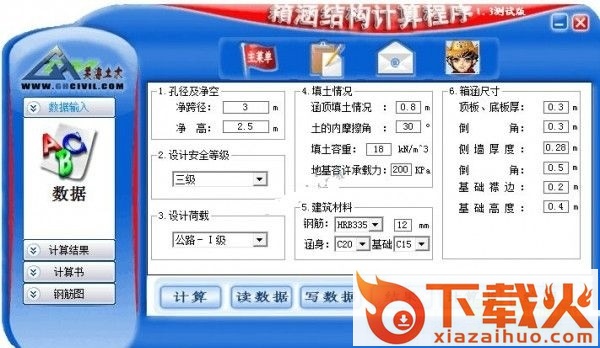 箱涵结构计算程序软件是一款专门为用户提供的钢筋混泥土结构计算工具,主要为用户提供便捷的计算功能,方便快捷,有需要者欢迎下载!
