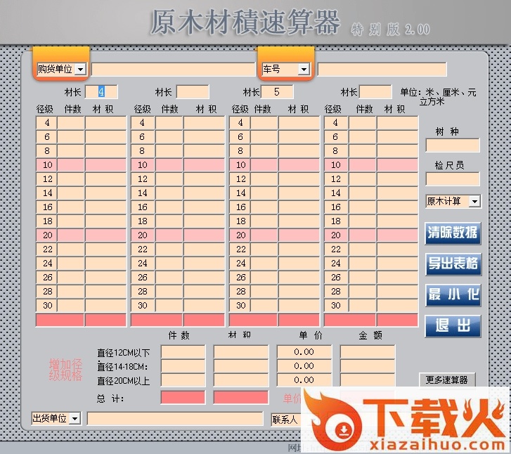 原木材积速算器可同时计算多种规格的木材材积,使用时输入材长、件数点击计算按钮可得到木材材积,径级、材长可根据需要任意调整。输入单价可一并计算出木材金额。点打印,可将当前数据打印出来做运输小票使用。使用电脑键盘的Tab键、回车键以及方向键配合移动光标输入数据更快捷,本速算器不仅大大提高您的工作效率,更是保证了您的计算数据准确无误,是您经营木材的得力助手。