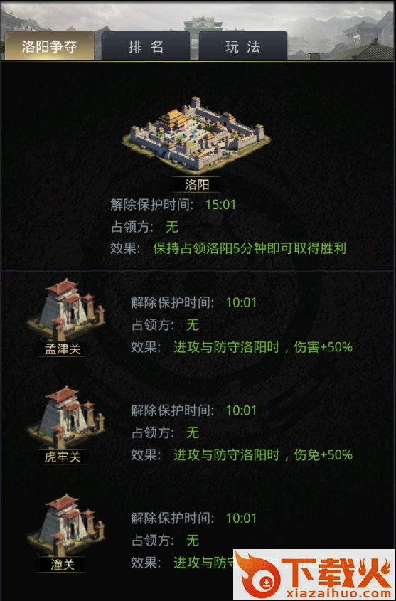 洛阳为天下之中,进入洛阳必须经过三个关口:孟津关、虎牢关和潼关。占领关口可获得进攻和防守洛阳时的加成效果,每个关口的效果不同。最终能否夺取洛阳,拥立天子成就霸业,除了自己的武将和部队的战力,还需要与盟友协同作战,最重要的还是谋略的运用。