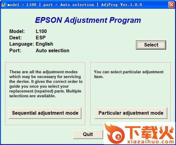 点右上面的 Select 设定你的 Epson L101 打印机的USB 端口,选择好以后点击 Perticular adjustment mode(维护功能)