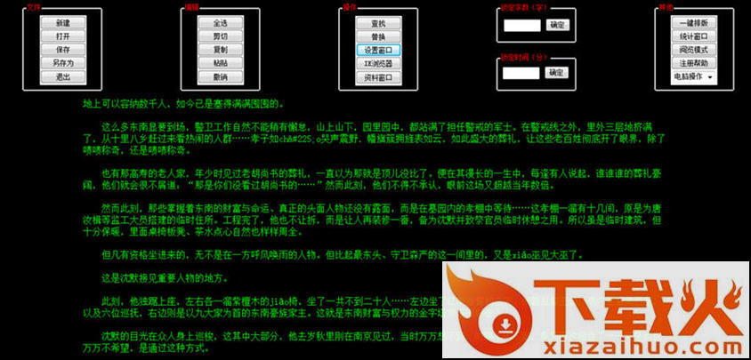 也有黑色。黑色界面加上翠兰笔迹,如夜空,像流星划过,是冷酷,是力量!最大的敌人是自己,黑色的夜空,只有你一个人,只有一支笔,虽千万万人,我往矣!本软件的界面定制功能为首创,可以自由定制各个部分、上中下左右各个方面的背景颜色。在本软件里,默认设置了三套界面模式:其他同类软件所有的黑底绿字界面,小说站常用的浅蓝底黑色界面及仿微软word软件经典界面,懒得设置的话,可以直接使用这三个界面其中之一。