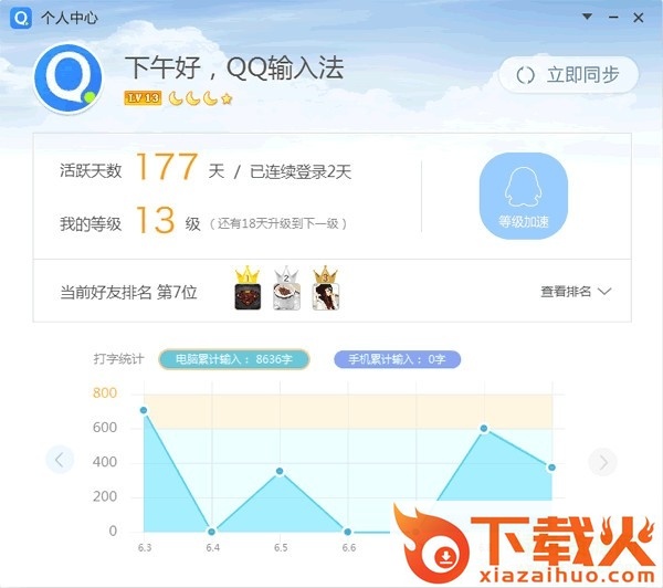 使用QQ账号登录QQ输入法,进入个人中心。您可以在个人中心内进行账户信息管理,查看自己或好友的输入法等级,查看历史输入字数等统计信息。