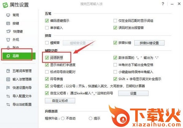 2.接着在打开的”搜狗五笔输入法设置“界面左侧的导航栏里点击”高级“;在辅助功能模块区找到”词语联想“一栏,(如下图所示)只需要在前面点击打勾,然后打勾以后,先点击”应用“再点击”确定“就可以了。