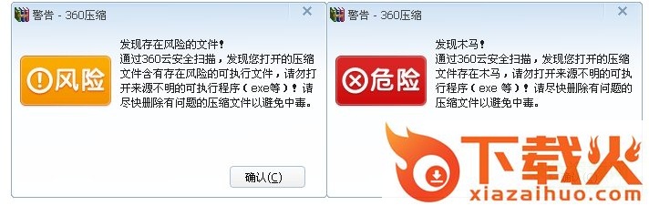 用360压缩打开一个压缩包后,会自动对压缩包内的文件进行云木马检测,保证使用安全。经过云木马检测后,360压缩会对压缩包内不同类型的文件进行安全评级,有效识别木马、脚本、普通文件、风险文件,并在界面右上角会有相应的图片提示。需要说明的是:在安全级别为木马的文件上双击文件会弹出阻止点击对话框,有效防止您误双击打开木马,更安全。 需要说明的是:在安全级别为木马的文件上双击文件会弹出阻止点击对话框,有效防止您误双击打开木马,更安全。