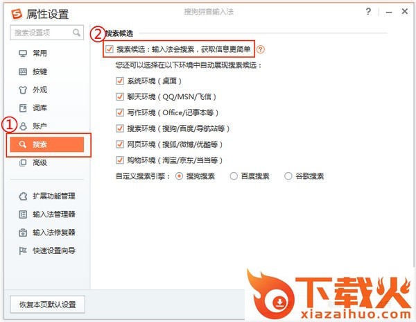 如果您希望开启或关闭搜索候选功能,按如下操作:打开输入法菜单-->属性设置-->搜索。 选择开启或关闭“搜索候选”即可。如果您取消了搜索候选功能勾选,输入法界面上将不再展现搜索候选下拉按钮,也将不响应↓方向键打开搜索候选结果。