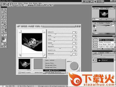 安装完毕后,运行Photoshop,打开一幅图像,然后你会在顶部菜单Fliter的下拉菜单中发现一个叫AV Bros的选项,在AV Bros中选择page curl选项,我们就进入到page curl的工作界面了(图1)。