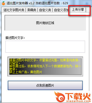 4、上传分享,可将自己制作的图片表情上传到逗比图片发布器上,让更多的人看到你做的表情图片。