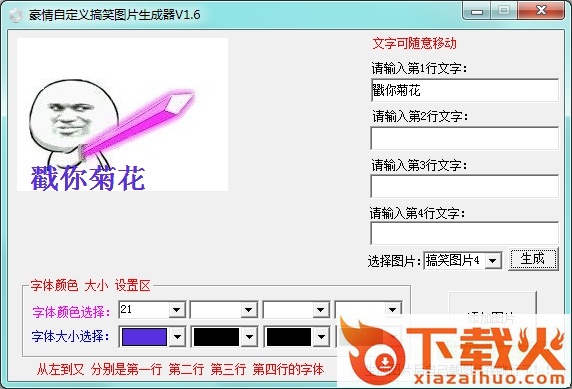 该图片支持自定义图片、自定义文字(4行文字)、自定义文字颜色大小等,生成只属于自己的搞笑图片。