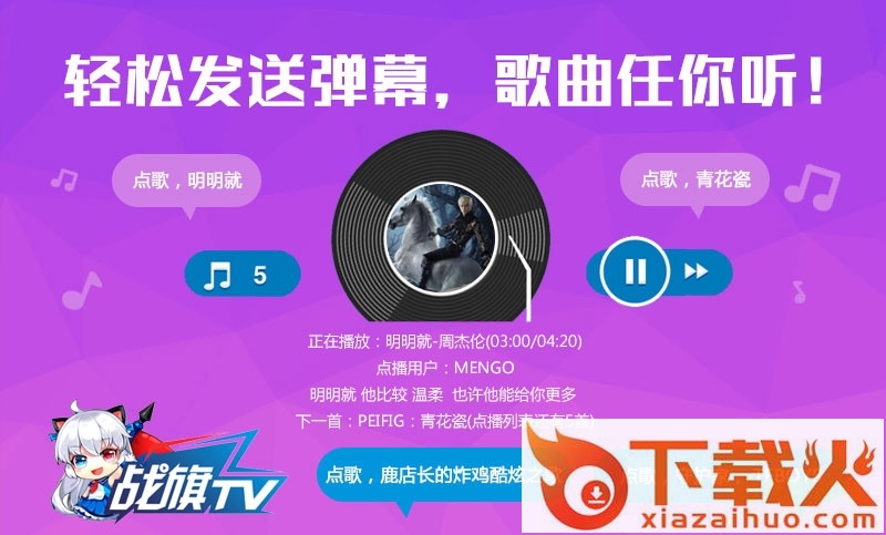 战旗tv弹幕点歌插件是一款让主播和观众们都能在直播界面点歌的插件,使用方便,海量音乐库随你设置,更好的调节直播气氛,绿色资源网诚意推荐!