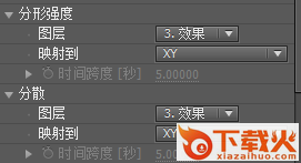 第十一步,继续调整图层映射下面的映射设置,在分形强度(fractal strength)和分散(disperse)中将图层设为“效果”,映射到XY上。