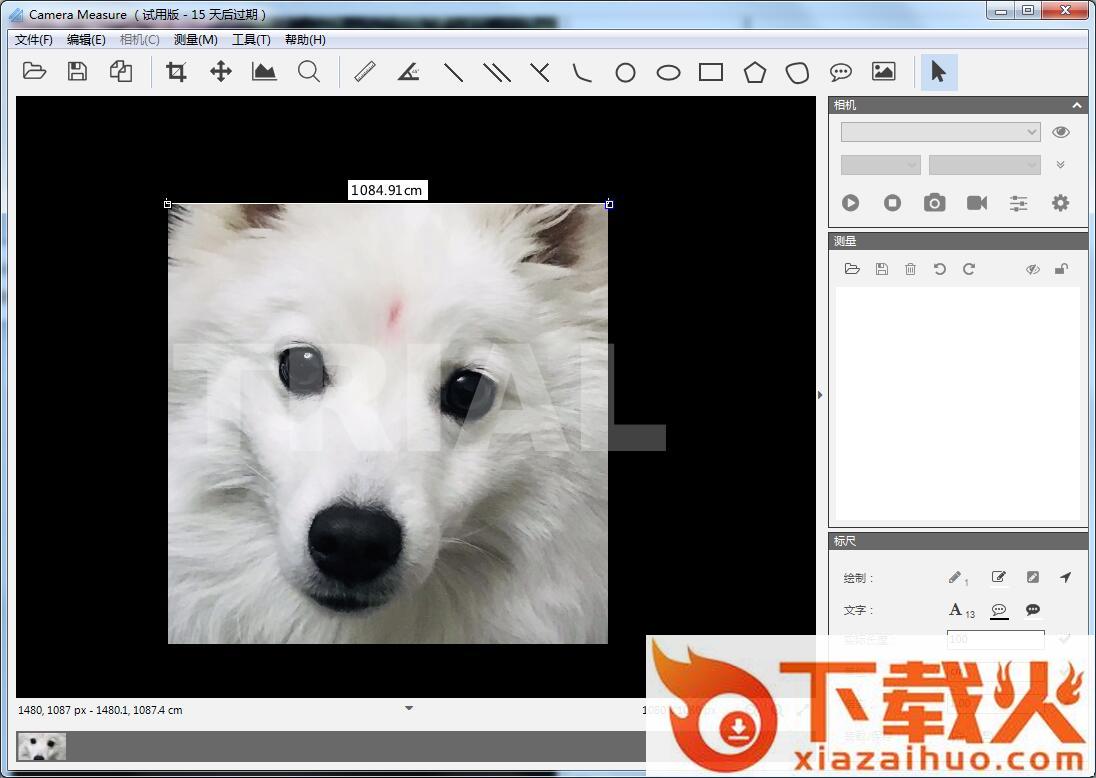 4、将鼠标移动到camera measure自带的测量直线的其中一端,鼠标显示十字光标,就可以对直线长度、角度进行调整了。将直线调整到与图片边缘平行,就可以测量图片的长度了,测量得到图片的长度为1084.91CM。
