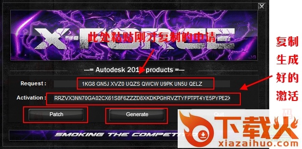 2、这时候找到注册机以管理员身份运行,点击界面上的“Patch”按钮(这里会修改系统Hosts屏蔽联网验证),将上一步复制的“申请号”粘贴到注册机界面“Request”栏,然后点击“Generate”生成激活码,最后将“Activation”栏算出来的激活码复制,注册机这时可以关闭啦;