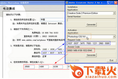 2、安装过程中会弹出激活界面,这时请点击左下角的“激活选项”,接着选“通过软件自动激活系统进行电话激活”,点击“下一步”,记下激活号(共7组),然后运行注册机Keygen.exe,在“Activation Application”中选“Photoshop CS2 9.0”,在“Request Code:”中输入刚才所记下的激活号,按下最下面的“Generate”按纽,就可以得到授权码Answer code(共5组)。