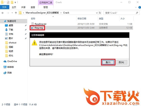 4、最后打开Crack文件夹,双击运行“Reg.reg”注册表文件,点击“是”,成功添加注册表文件即可激活软件(注意:首次运行一定要在断网条件下)